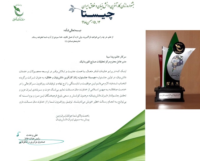 انتخاب مرکز تحقیقات صنایع انفورماتیک بهعنوان شرکت برگزیده و اعطاء گواهی و تندیس زنان کارآفرین دانشبنیان و خلاق ایران، از صندوق نوآوری و شکوفایی ریاست جمهوریانتخاب مرکز تحقیقات صنایع انفورماتیک بهعنوان شرکت برگزیده و اعطاء گواهی و تندیس زنان کارآفرین دانشبنیان و خلاق ایران، از صندوق نوآوری و شکوفایی ریاست جمهوری
