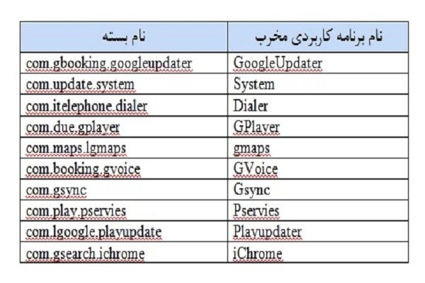 در جدول زیر فهرستی از نام برنامههای کاربردی مخرب به همراه نام بسته آنها مشاهده میشود.