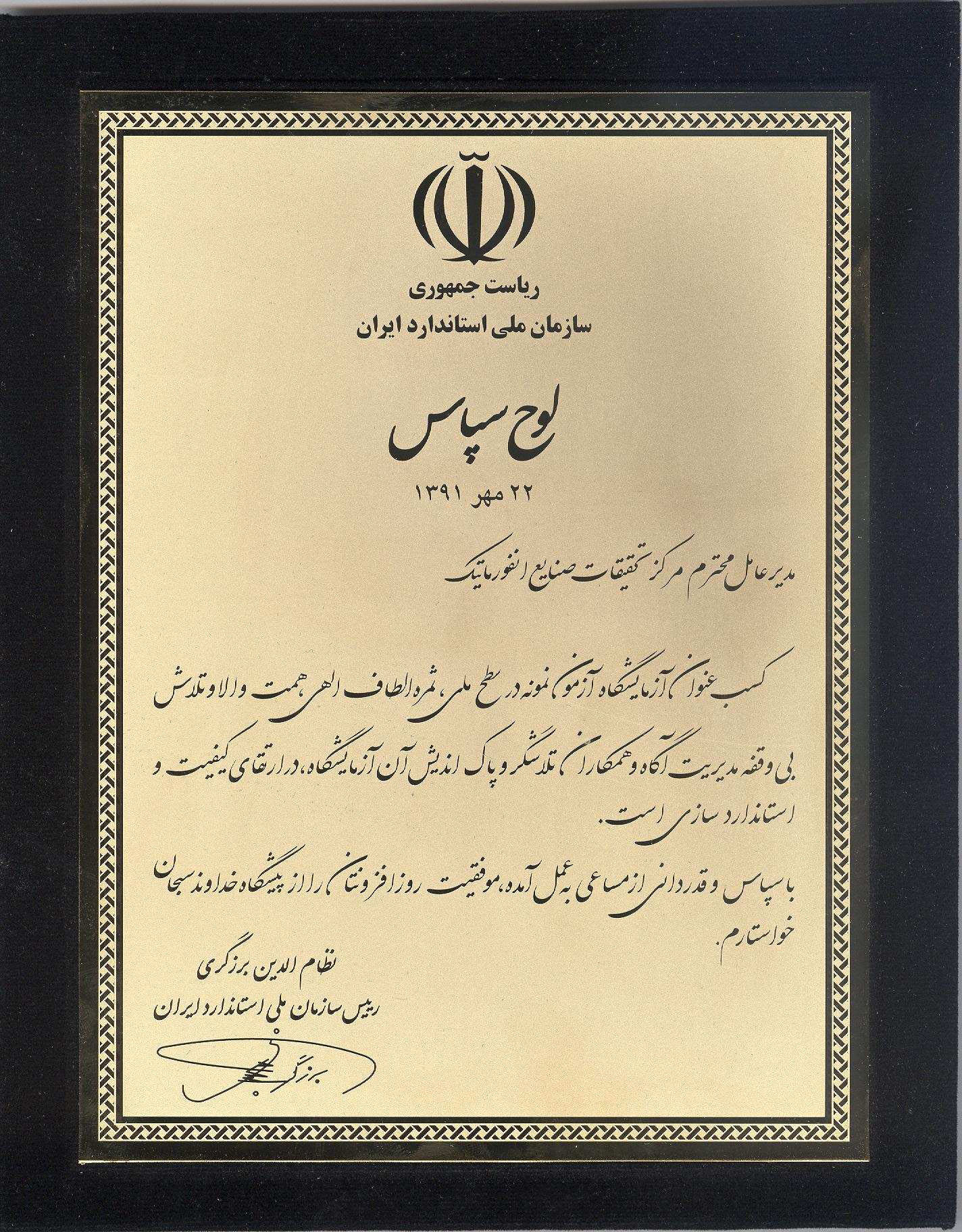 لوح سپاس آزمايشگاه نمونه کشوری سال 1391